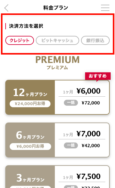 ※クレジットカード決済のほかにも「銀行振込決済」と「ビットキャッシュ決済」が選択できます。画面上部のタブで切り替えられるほか、下にいくと選択ボタンも出てきます。