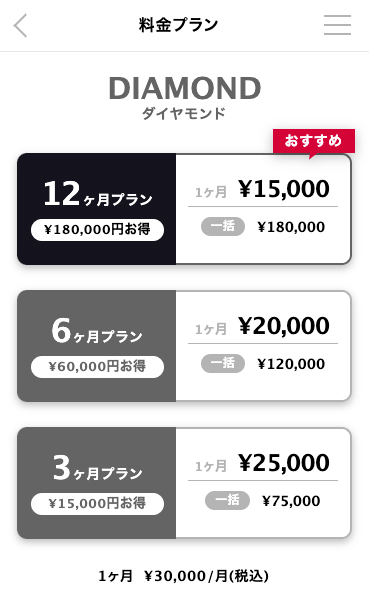 | 12ヶ月プラン料金 | 0円 | 72,000円(税込) (6,000円/月) | 180,000円(税込) (15,000円/月) |