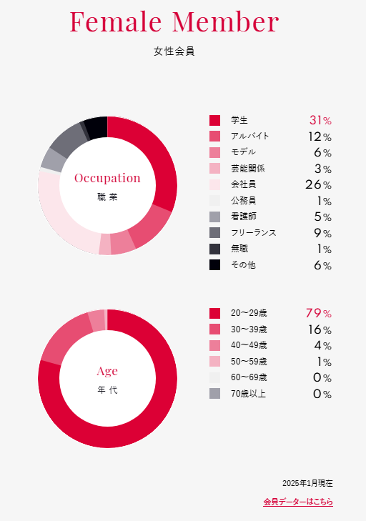 女性側は大学生くらいの年代から30代くらいがメインの年代。男性はお金さえあればモテますが、30代〜50代くらいがメインの年代になります。