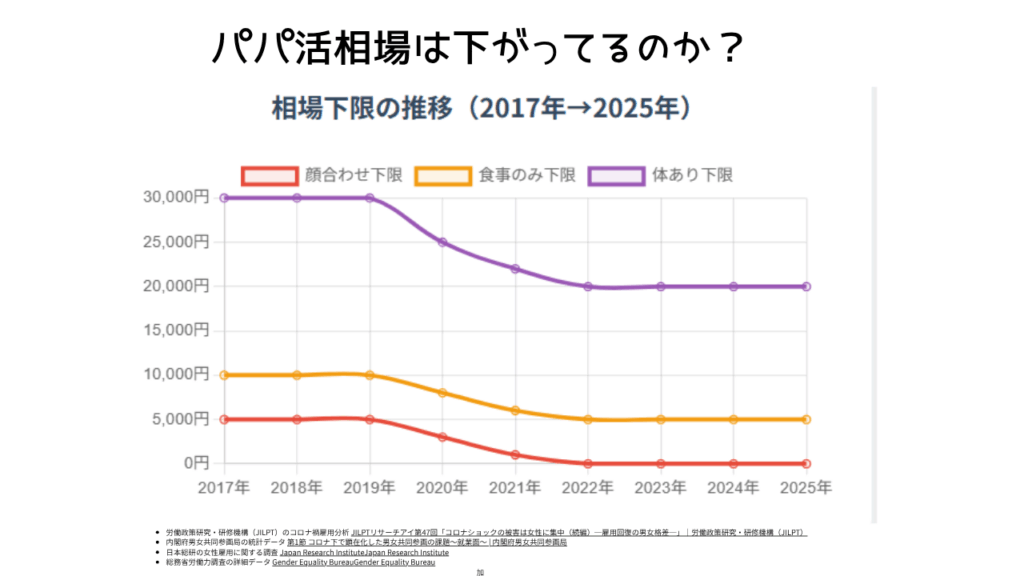 お金持ちな男性と見目麗しい女性だけの世界だった「パパ活」が一般層にまで降りてきたことで、全体的な相場が下がってしまったのです。