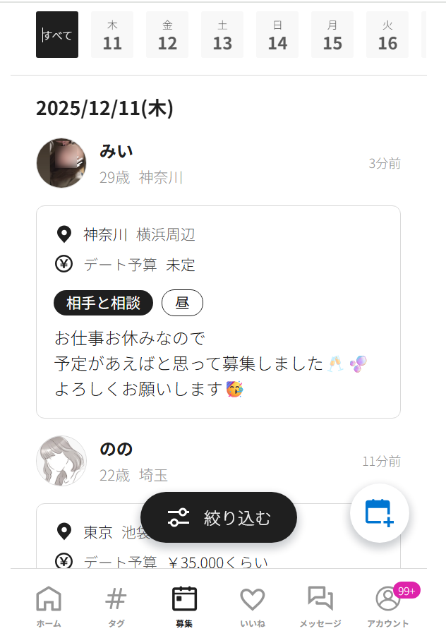 カレンダーに自分がデートできる日程を登録しておくと、登録した日が「本日会いたい」の検索結果に表示されるようになります。