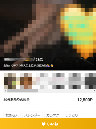 ほかのギャラ飲みアプリと比べると「女性のレベルも料金も高い」といった評判で、見た目に自信があって稼ぎたい女性におすすめのサービスです。