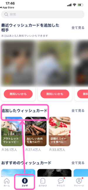 ホーム画面に出てくる相手だけでなく「さがす」のページからはウィッシュカードが一致する相手を選ぶことができます。