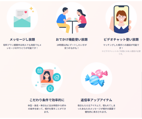 無料会員ではできないメッセージ、おでかけ機能、ビデオチャットが無制限で使えるようになります。