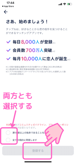 利用規約、コミュニティガイドライン、プライバシーポリシーに同意して「登録する」をタップします。