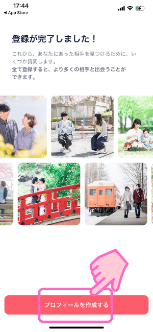 この時点でとりあえずの登録は完了ですが、このままプロフィール作成が続きます。