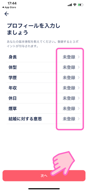 またプロフィールを登録する際に、項目をたくさん入力すればするほどポイントがもらえます。登録後24時間以内にプロフィール写真をアップすれば、さらに100枚のポイントがもらえますよ!