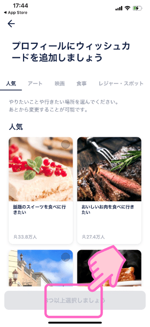 「話題のスイーツを食べに行きたい」や「映画を観たい」などがあり、同じウィッシュカードを選択した人とマッチングできます。