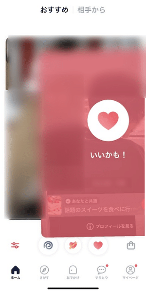 そしてこの人が気に入ったら右にフリックすると、いいかも!が送られます。