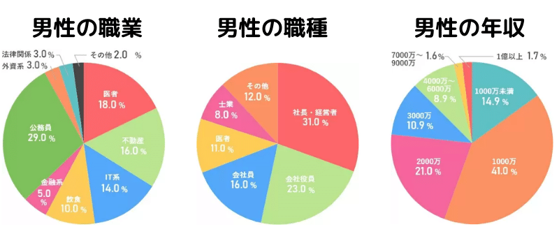 年収2,000万円超えの男性が90%超と、かなりのセレブ層が登録されています。