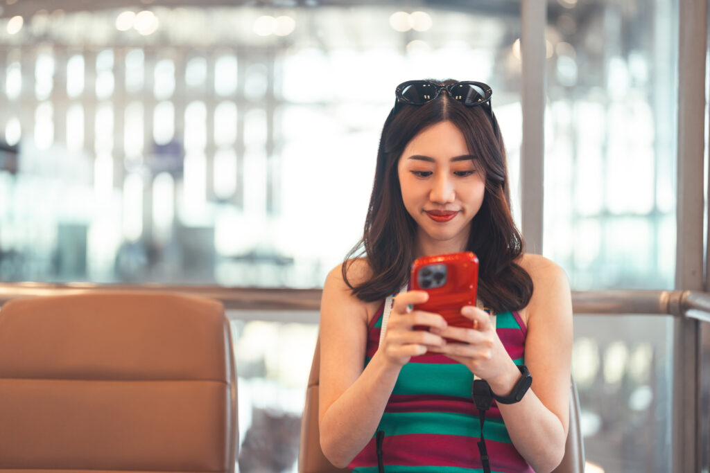 Passenger at international airport terminal for departure with airline transport. Tourist woman using smartphone with happy smile face. People journey on holidays.