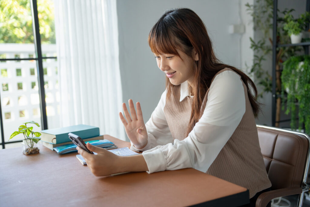 Asian woman video call with friend by smartphone.