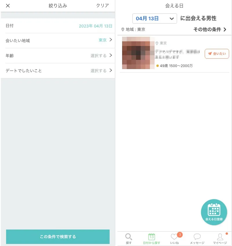 これは会える日にちを設定しておくと、その日に都合の良いお相手が表示される機能です。「会いたい」ボタンをタップすると、そのお相手に「会いたいメッセージ」が送信されます。