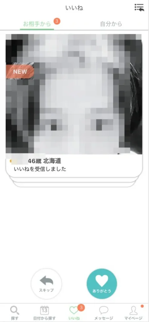 たとえば「いいね」をくれた人のなかからお相手を選びたい場合「スキップ」と「いいね」ボタンで振り分けていくだけでOK。プロフィール画像の第一印象で絞り込んでいきます。