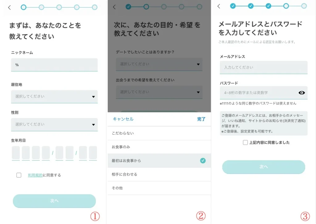 登録自体は簡単。まずはニックネームや居住地、性別、生年月日を入力しましょう。